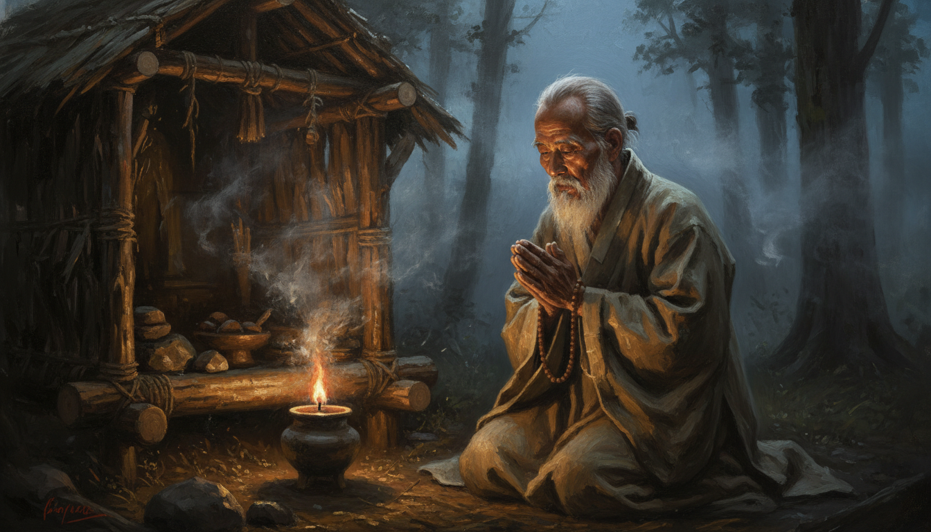 Under the vast, star-dusted canopy of a Silla Dynasty night, a profound quietude enveloped the small village nestled at the foot of Mount Namsan. The usual daytime sounds of laughter, bargaining, and agricultural toil had long since faded, replaced by the rustle of leaves in the gentle breeze and the distant hoot of an owl. Yet, within the village, a single figure moved with deliberate, silent reverence towards the community’s small, unassuming shrine dedicated to the local mountain spirit. This was Master Jeong, the village’s spiritual guide and elder, a man whose face, etched with the lines of seventy winters, reflected a deep serenity and unwavering faith.
