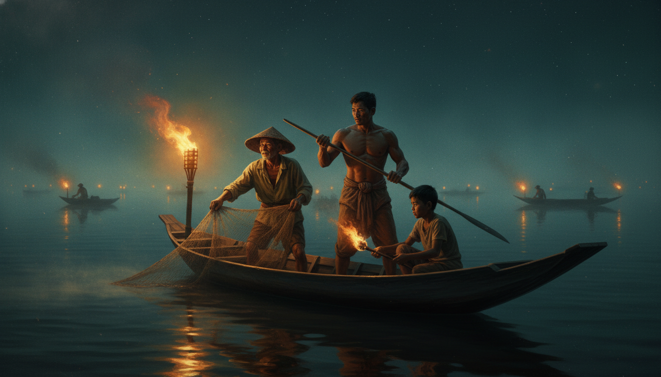On the tranquil expanse of the Tonlé Sap lake, a vital artery of the Khmer Empire, as twilight faded into an inky blackness, a different kind of village awoke. This was not a village of fixed dwellings, but a floating community of fishermen, their lives intimately entwined with the ebb and flow of the waters. Tonight, like countless nights before, the call of the lake was strong. Three figures—the seasoned elder, Old Man Sopheak, his stalwart son, Sokha, and the young, eager grandson, Dara—prepared their long, narrow fishing boat, a ‘rua,’ for the night’s endeavor. The air was thick with the scent of water, mud, and dried fish, punctuated by the occasional croak of a bullfrog. Their equipment was simple but effective: nets carefully mended during the day, bamboo poles, and most importantly, large, flaming torches crafted from resinous wood and bound with palm fibers. These torches, once lit, would serve as both beacons and attractants for the fish.
