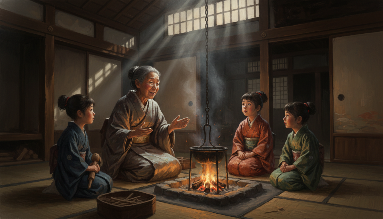 In a secluded village nestled within the misty mountains of Heian Japan, as the cool evening air began to descend, the central hearth became the heart of every home. The farmer, Kenji, his wife, Hana, and their three children—young Ichiro, playful Midori, and the quiet infant, Haru—gathered around the smoldering embers. The only light in their modest wooden dwelling emanated from the fire, casting dancing shadows on the rice paper screens and illuminating the deeply lined face of Kenji’s mother, Grandmother Sato. Her eyes, though dimmed by age, held the spark of countless winters and the wisdom of generations.